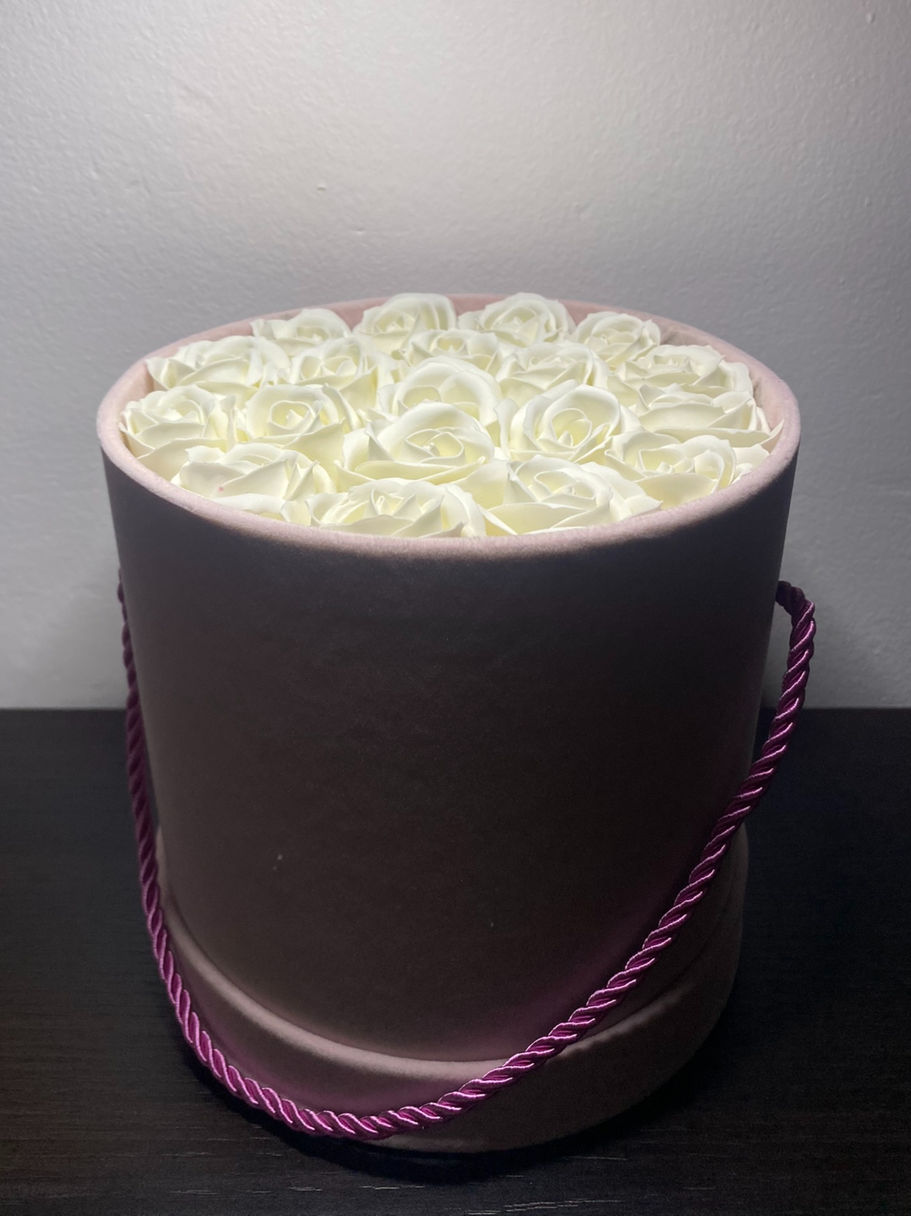Lasă-te cucerit de eleganța subtilă a White Velvet Bloom – un aranjament delicat de trandafiri albi din săpun, așezați cu grijă într-o cutie luxoasă de catifea roz pal. Această combinație armonioasă între puritatea florilor și finețea nuanței roz oferă un cadou care vorbește despre gingășie, afecțiune și feminitate.