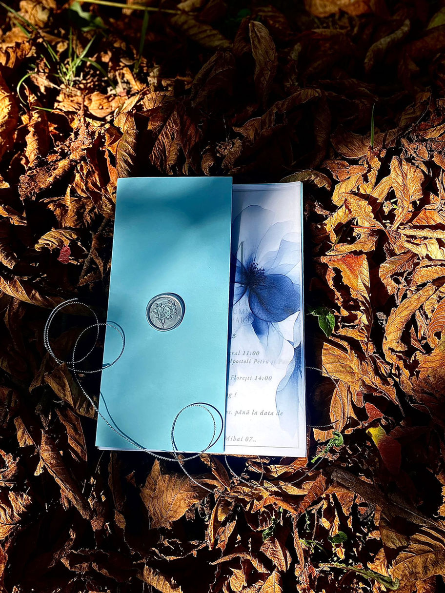 Invitația include : Carton 250 gr., tiparirea textului, hârtie decor semitransparentă + capsă metalică gri, Plic/învelitoare culoarea albastru deschis, sigiliu ceară silver leaf, șnur argintiu, asamblarea invitației este inclusă în preț.